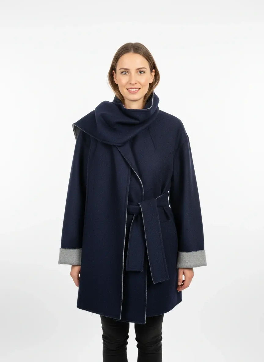 Manteau Écharpe Double Face en Laine Mélangée – Bleu Marine & Gris